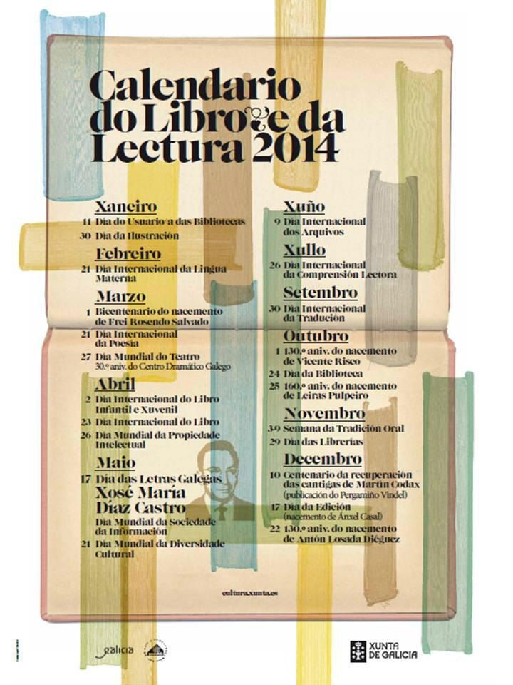 Con motivo da celebración do Día das Librerías (último venres de novembro), a Consellería de Cultura, Educación e Ordenación Universitaria distribúe o Calendario do Libro e da Lectura 2014, unha lámina coas datas máis sinaladas arredor dos libros.